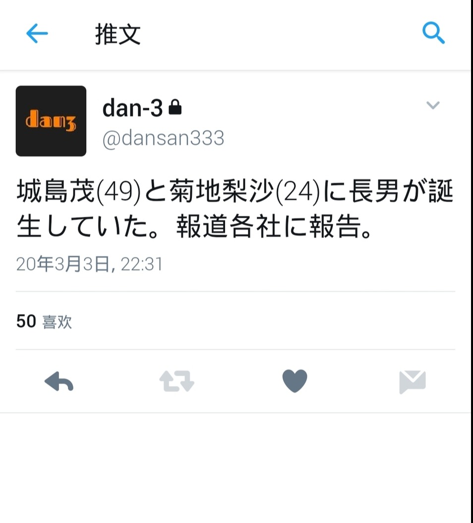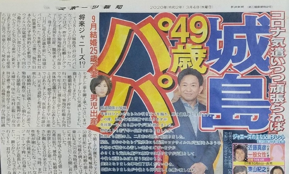 据日媒报道,近日,杰尼斯旗下男团TOKIO的队长城岛茂宣布升级当爸,小24岁的妻子已于2020年2月中旬产