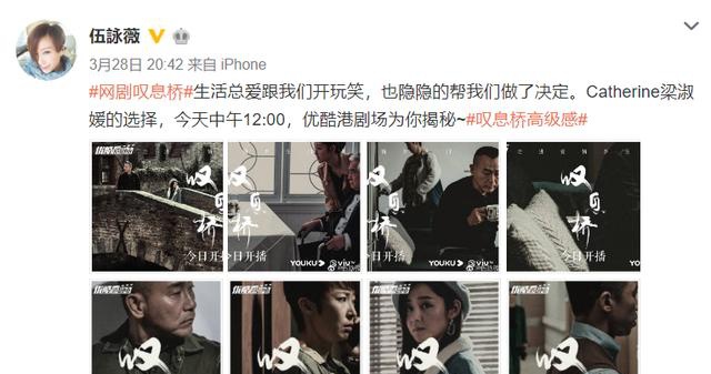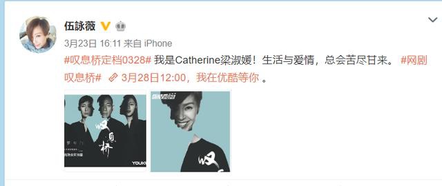 3月28日由伍咏薇、林保怡、秦沛、周佳怡等人主演的网剧《叹息桥》正式上线,伍咏薇本人也积极宣传了这部作品。