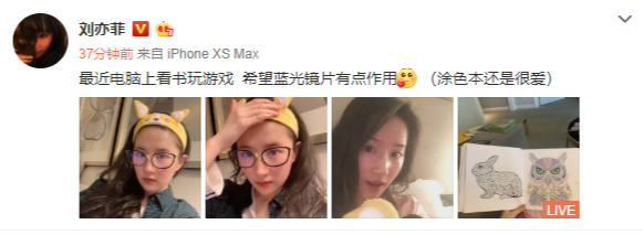 29日,刘亦菲晒出一组自拍,并配文:“最近电脑上看书玩游戏,希望蓝光镜片有点作用。(涂色本还是很爱)