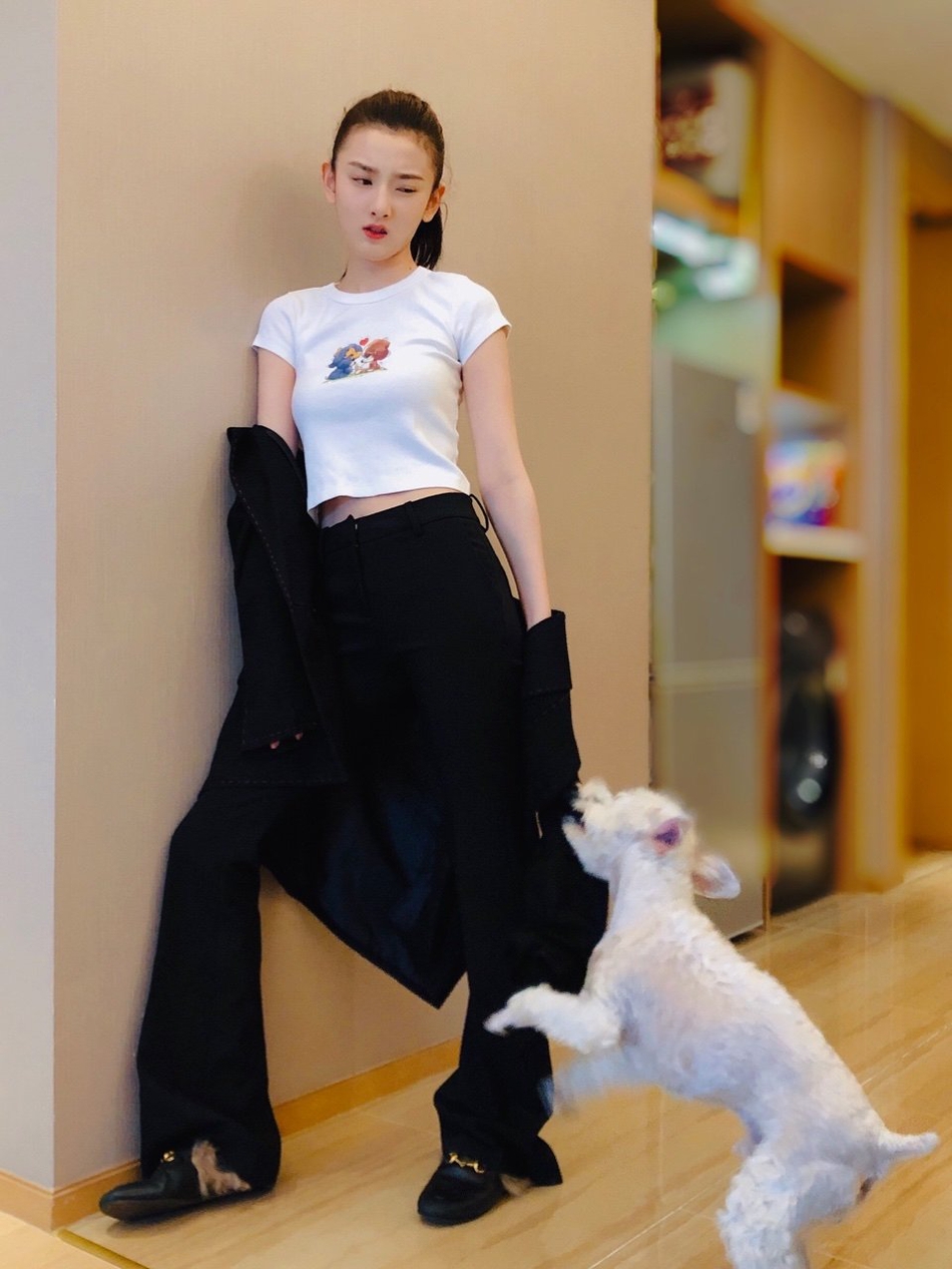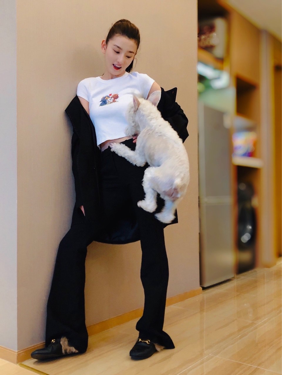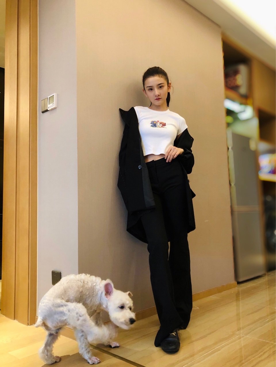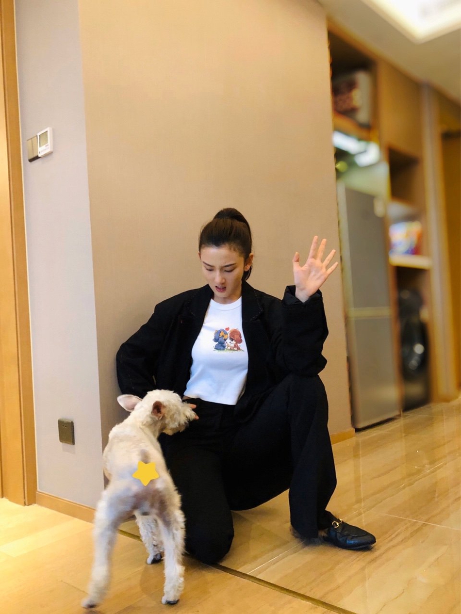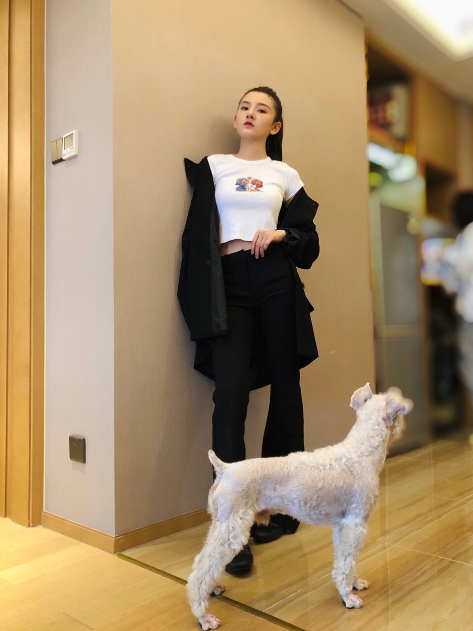 照片中,梳着元气高马尾,身穿白色T恤搭配黑色西装外套的宋祖儿正对着镜头摆poss,而可爱的狗狗康康正围绕着小主人蹦蹦跳跳,甚至试图用咬住小主人衣服来得到回应,真是实力抢镜!
