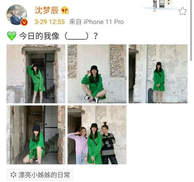 3月29日下午,沈梦辰在个人社交平台上分享了一组与好友出游的美照。照片中,沈梦辰戴着黑色渔夫帽,秀发披肩,身穿绿色卫衣搭配同色系休闲短裤,脚踩白色时尚鞋子,白皙修长的美腿十分抢镜。此刻的她还靠着墙壁摆pose,慵懒随性超美哒。