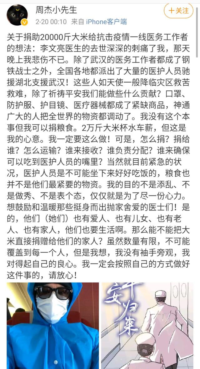 对于大家的质疑,周杰也是专门发博回应,表示自己没办法筹集医用物资,只能通过捐赠大米来出一份力,并且在长微博中写到:"我的目的不是添乱、不是作秀、不是表个态,仅仅就是为了尽一份心力。"
