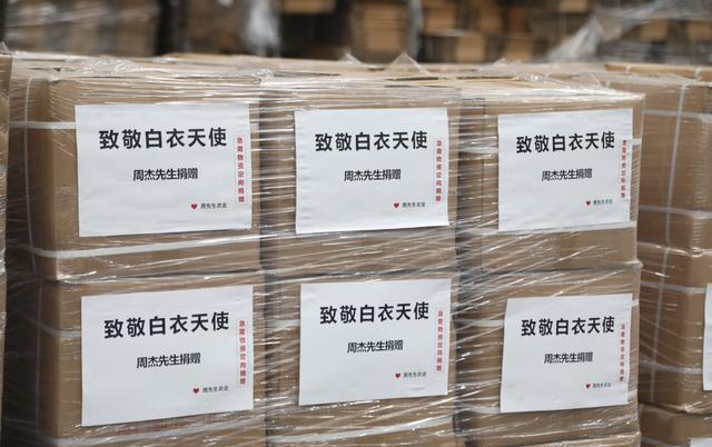 从照片中可以看到,物资的箱子上写着"致敬白衣天使,周杰先生捐赠",一箱一箱的物资已经打包完整的捐赠给一线工作人员。