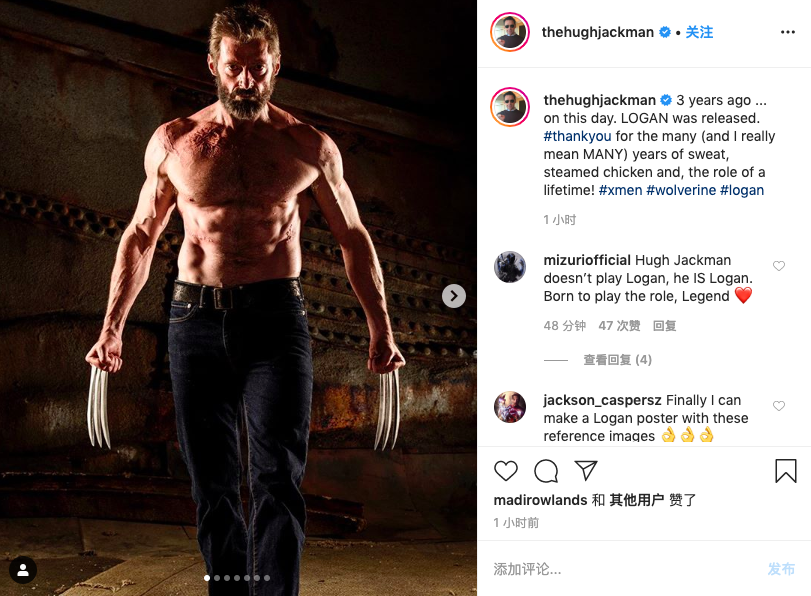 3日,《金刚狼3:殊死一战》上映三周年,休杰克曼在社交网站晒定妆照纪念,并幽默称这一角色是用多年的汗水和一顿顿鸡胸肉换来