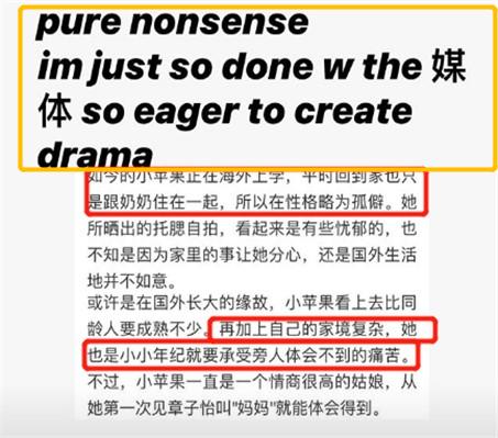 小苹果晒出一张媒体报道的截图,上面写着“小苹果正在海外上学,平时回家也只是跟奶奶住在一起,所以性格略为孤僻。”还表示她“家境复杂,小小年纪就要承受旁人体会不到的痛。”将小苹果塑造成深受原生家庭影响而成为一个早熟孤僻的女孩的形象。