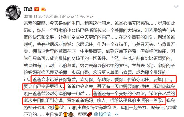 面对外界的质疑,汪峰、章子怡和小苹果都没有理会。去年小苹果生日时,汪峰发表长文,表达了自己对小苹果满满的爱,他表示:“爸爸会永远站在你背后,支持你,帮助你,爱你!”力破再婚后冷落与前妻所生女儿的传闻。