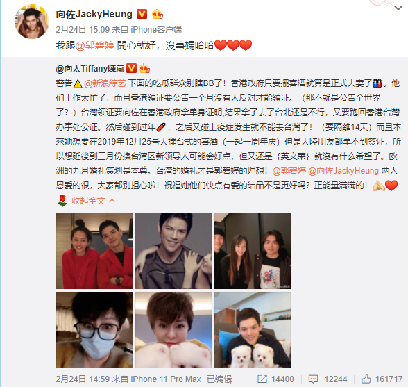 事后向太发长文回应,表示小两口恩爱的很,领证、摆喜酒的很多事项受到各方面影响暂时耽搁了,但看意思后面会全都策划好,满满补上的——