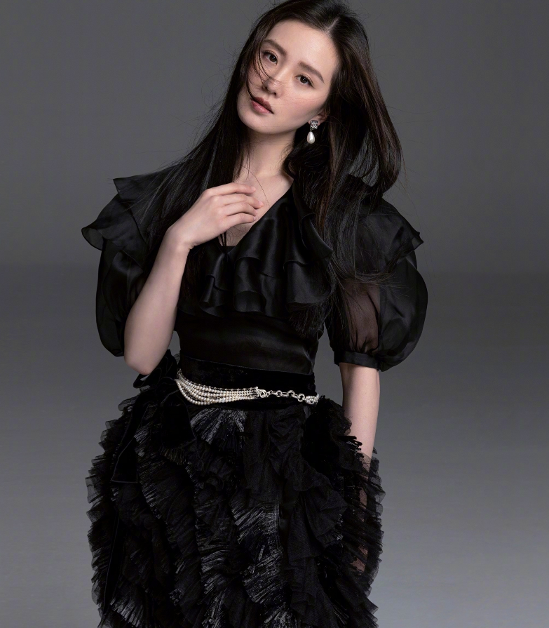 刘诗诗黑色连衣裙搭配白色内搭,显露优雅身形。