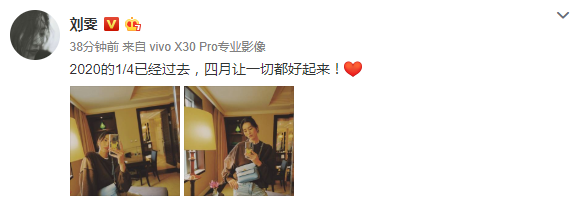 4月2日,刘雯在个人社交平台上分享了两张自拍,并配文:“2020的1/4已经过去,四月让一切都好起来!”