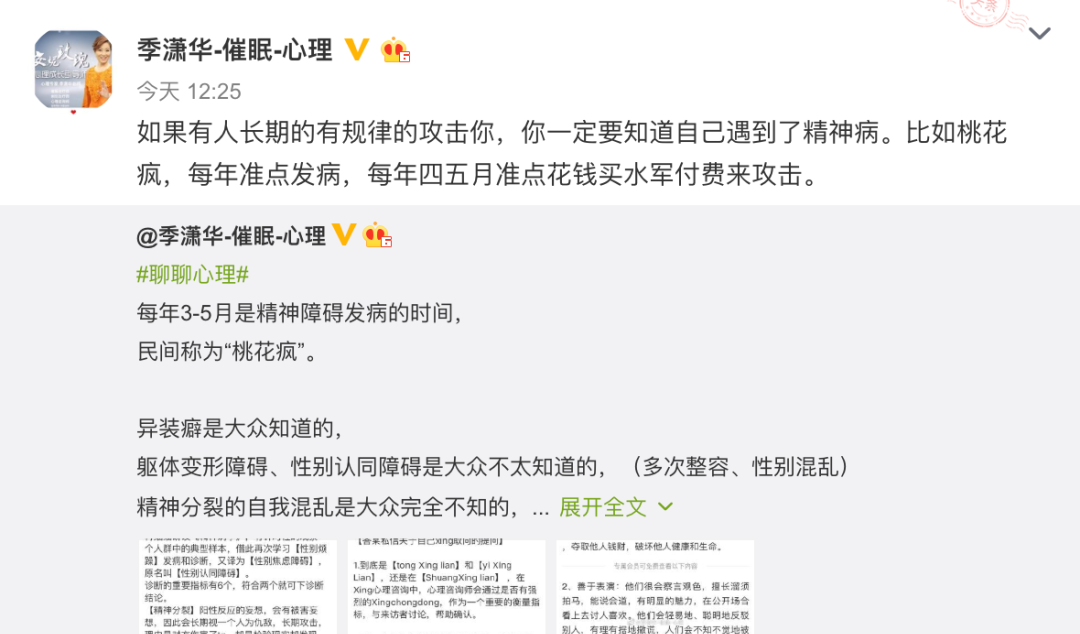 期间她改了个神神道道的网名,叫"季潇华-催眠-心理"。还给自己买了一大堆看起来很厉害,其实啥也不是的人物认证,比如"知名心理博主"、"XX中心理事长"。