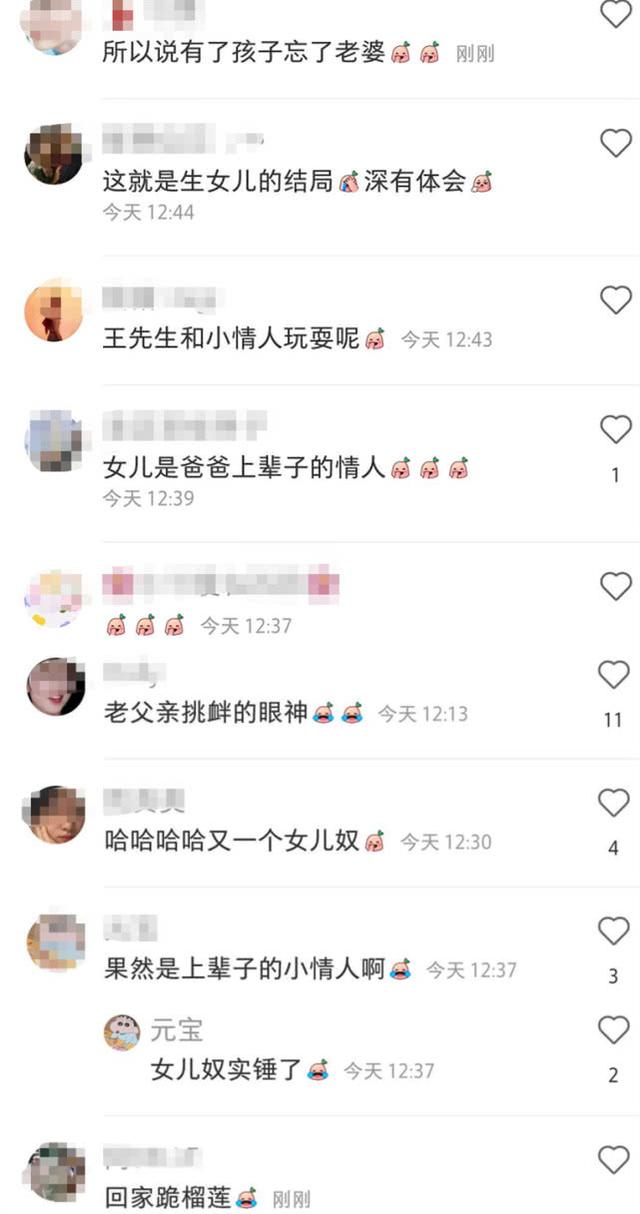 看到李亚男的动态后,网友纷纷留言打趣:“这就是生女儿的结局,深有体会”、“所以说有了孩子忘了老婆”、“女儿是爸爸上辈子的情人”。