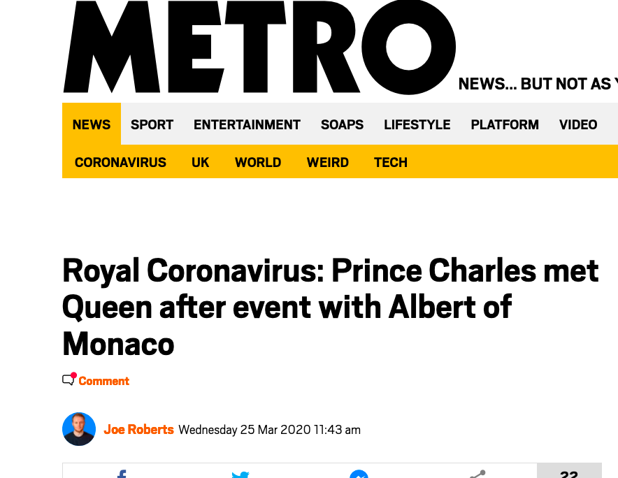 英国《每日邮报》称查尔斯王子曾于本月中旬与后来被证实感染的摩纳哥元首阿尔贝二世亲王有过会面,当时两人对面而坐。