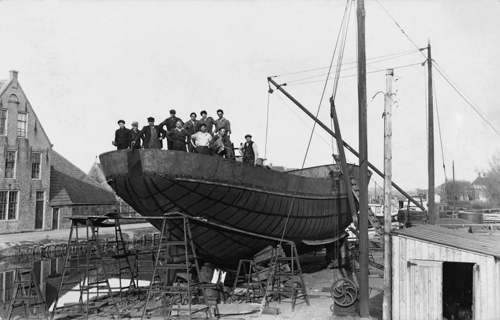 ▲遨慕世的创始人(左三),这是1946年建成的一艘渔船。