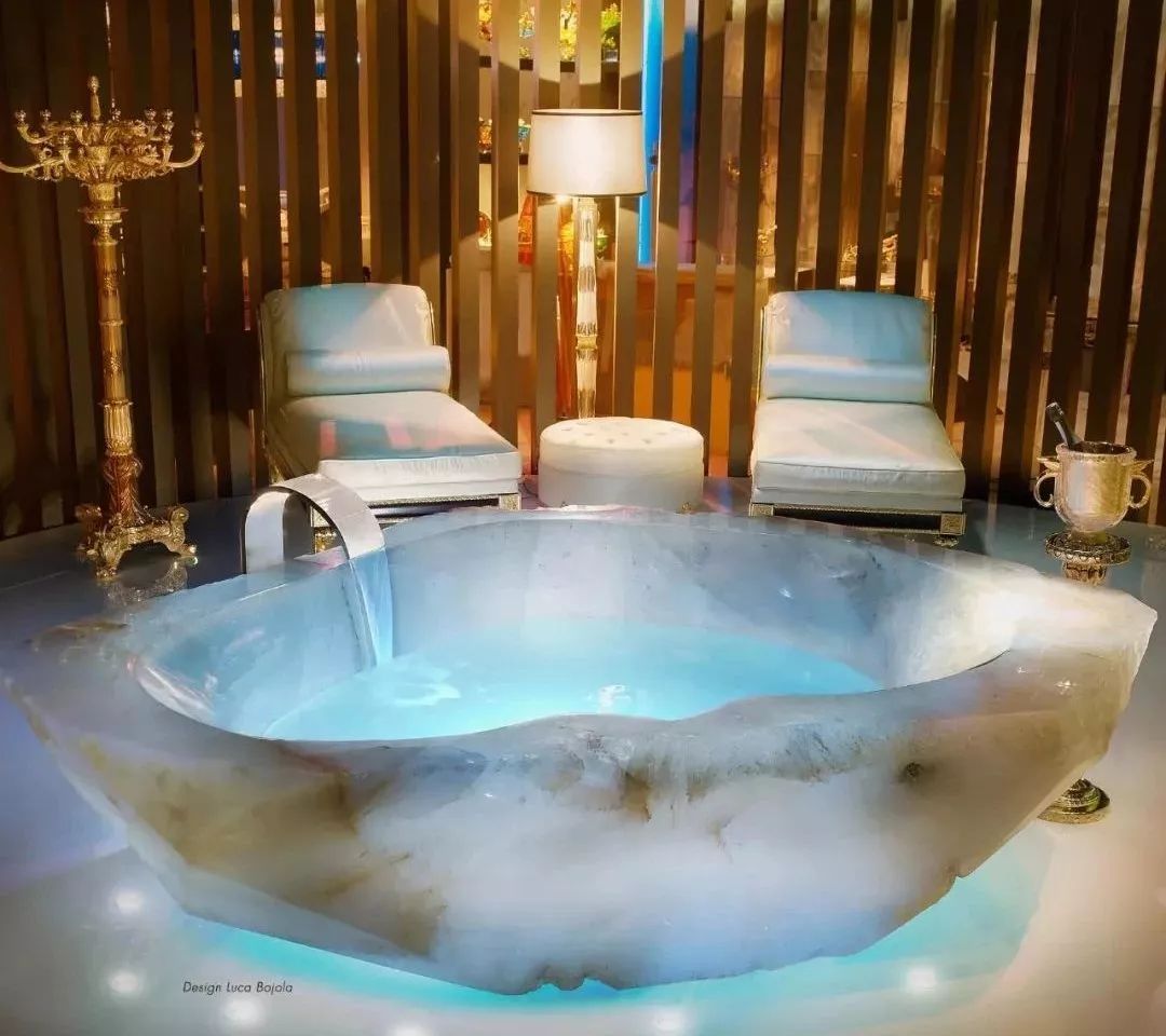花上天价数字,只为打造一个浴室,并不罕见。世界上最贵的浴缸叫BALDI 浴缸,是用产自巴西的一整块白水晶切割打造成的。放满水的浴缸有一种天然的梦幻感。