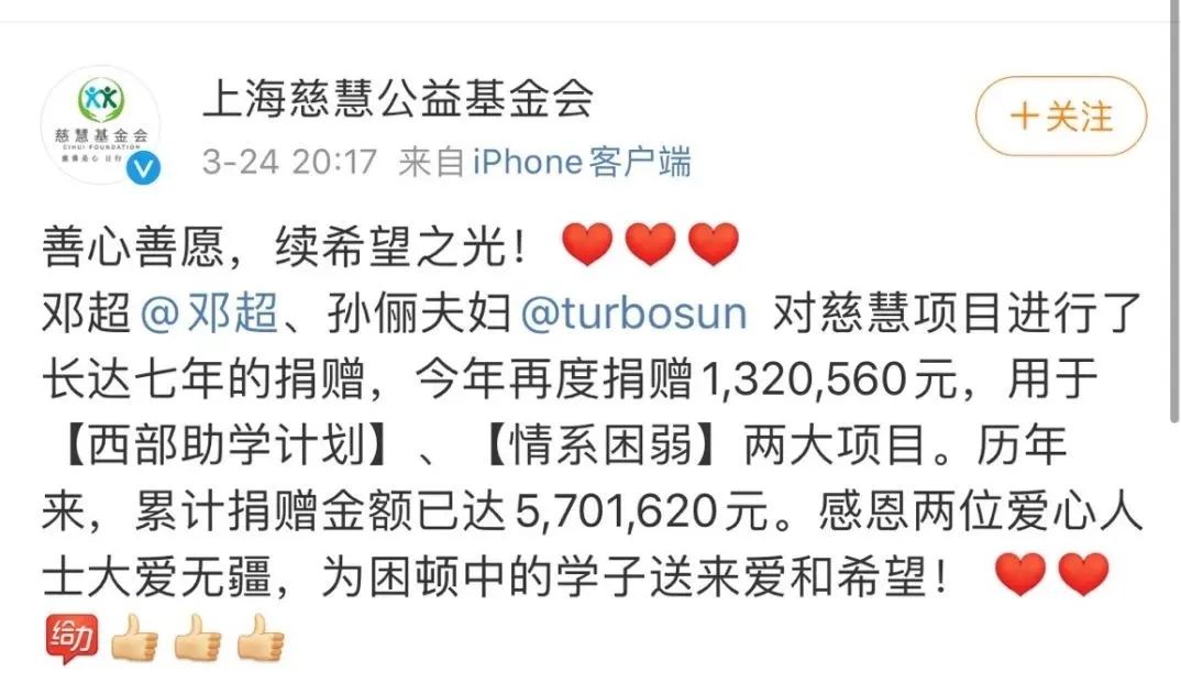 ▲ 她把自己在“等花开杂货铺”卖闲置商品的所得都捐给了上海慈慧公益基金会,用来资助贫困学子。她和邓超两人七年累计捐款已经达到了570余万。