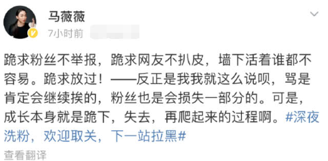 马薇薇似乎认为在这种情况下粉丝做过多辩解,反而激化矛盾,不如肖战主动站出来做一个正面表态。没过多久马薇薇再次发文:“跪求粉丝不举报,跪求网友不扒皮,墙下活着谁都不容易。跪求放过!——反正是我我就这么说呗,骂是肯定会继续挨的,粉丝也是会损失一部分的。可是,成长本身就是跪下,失去,再爬起来的过程啊。”马薇薇或许是遭到了部分粉丝的扒皮举报,才会求生欲满满如此发文。