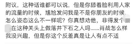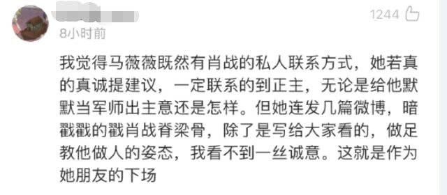 马薇薇的发文成功的惹怒的一些肖战粉,虽说是为肖战支招,但粉丝们却是毫不领情。有粉丝发文表示:“我觉得马薇薇既然有肖战的私人联系方式,她若真诚的提建议,一定联系得到正主,无论是给他默默当军师出主意还是怎样。但她连发几篇微博,暗戳戳的戳肖战脊梁骨,除了是写给大家看的,做足了教他做人的姿态,我看不到一丝诚意,这就是作为她朋友的下场。”