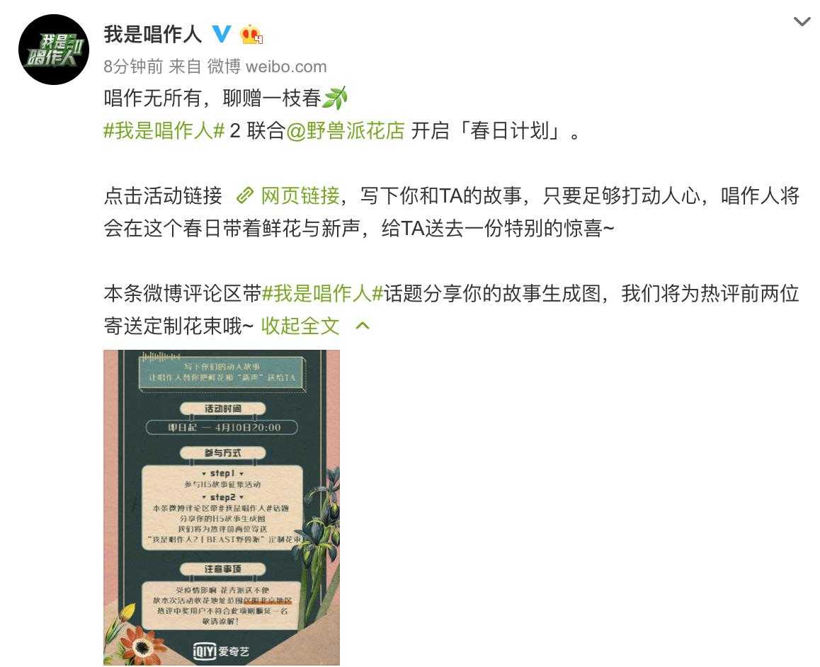 此次春日计划中,爱奇艺《我是唱作人2》与BEAST野兽派共同发布素人音乐故事征集H5,鼓励网友说出自己最想送花的人——或者是生命中特别的存在,或者是不知道姓名却想表示感谢的人。网友写下自己和TA的故事,并且为TA点歌,让音乐和春天一起到来!