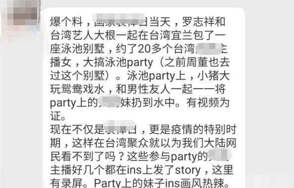 爆料的网友表示,为了能尽情玩耍,当时罗志祥和大根等人包了泳池别墅,私密性高、环境优美。不仅如此,为了能让派对更刺激,罗志祥等人还邀请了20多名嫩模到现场助阵。