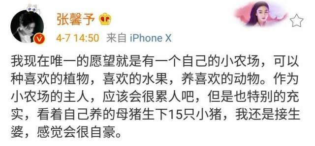 4月7日,张馨予还在社交平台分享了自己目前的愿望,她写道:“我现在唯一的愿望就是有一个自己的小农场,可以种喜欢的植物,喜欢的水果,养喜欢的动物”。张馨予甚至还幻想自己养的母猪生下了15只小猪,而自己作为接生婆感到很自豪。看得出来,她彻底爱上了这种悠闲惬意的农场生活,而且已经深陷其中无法自拔了。