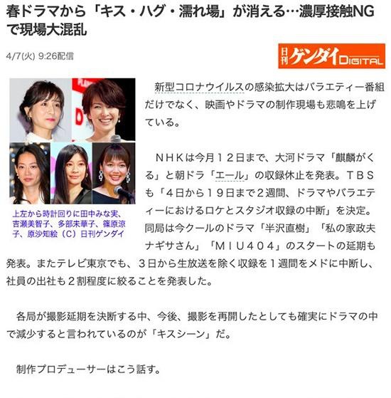 4月7日,据日媒报道,受疫情影响,目前日本各家电视台的电视剧拍摄都已经陆续停止。此外,重启拍摄时,各剧组也被明令要求减少拍摄接吻、拥抱等亲密的戏份,以防止新冠病毒的传播。