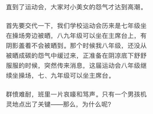 爆料者称,学校举行运动会,往年都是初中一年级的学生搬着凳子坐在操场上暴晒,初二和初三的学生坐在主席台。但是这位小明星入学了之后,搬着凳子坐在操场上的就变成了初二的学生。
