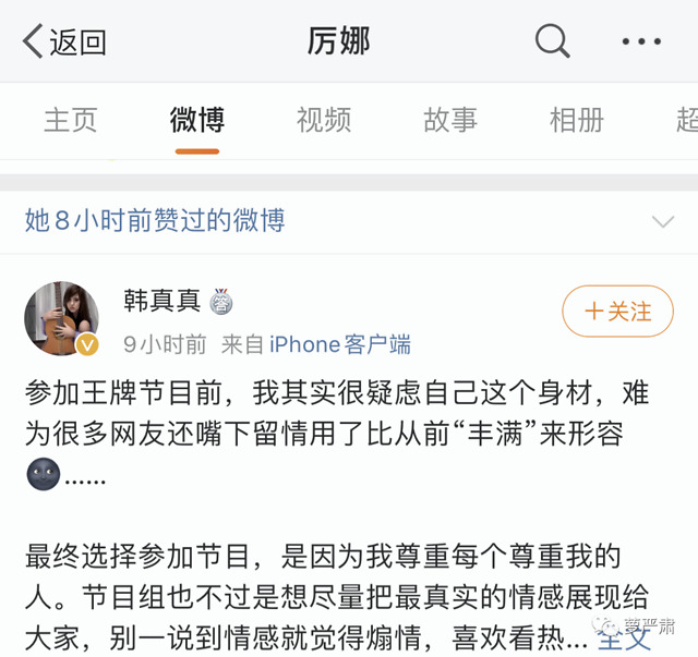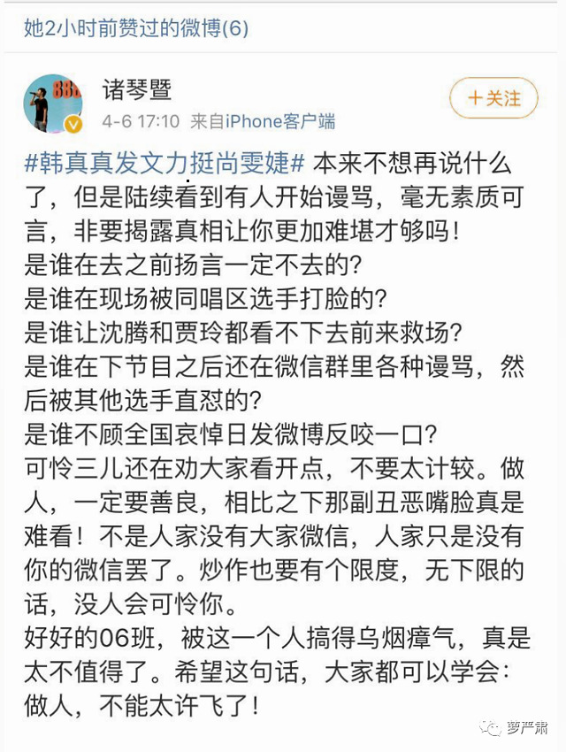 之后韩真真还点赞了一条斥责许飞炒作作秀的微博,发微博的博主认证是报社记者。这条微博话说得挺狠,并且还透露了一些细节:许飞下节目有在群里面谩骂,被其他选手怼了。另外,尚雯婕不是没有其他选手微信,只是没有加许飞的微信。