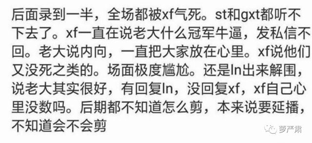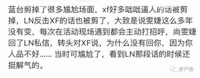 网络上还出现了多方爆料,称这个剪辑过的版本据说还是比较缓和的。现场观众表示,厉娜不但维护尚雯婕,还直接对许飞说:“为什么没有回你,因为你人品不好。”