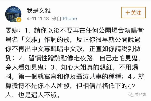 张靓颖被传分手自己就没说啥,尚雯婕和文雅大战好几个回合,文雅说尚雯婕“习惯性蹭热度”,自己如果真想红就爆料尚雯婕和其合伙人聂心远(聂涛)的内幕。