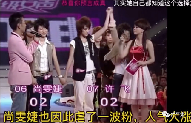 06超女本来就是血雨腥风的一届,那年的规则是选手要在两个待定之间选一个人支持,票数多的安全,票数少的去PK,于是各种暗搓搓的人际关系就产生了。默认的是要支持同赛区的人,在厉娜坚定支持同赛区许飞之后,刘力扬把同赛区尚雯婕推向PK台,直接影响了自己的人气,尚雯婕因此虐粉而反而人气上涨。