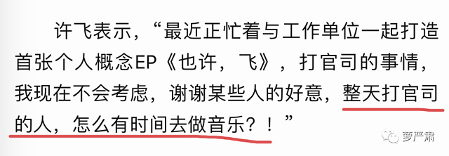 在媒体采访里,许飞话里有话,“谢谢某些人的好意,整天打官司的人,怎么有时间去做音乐?!”