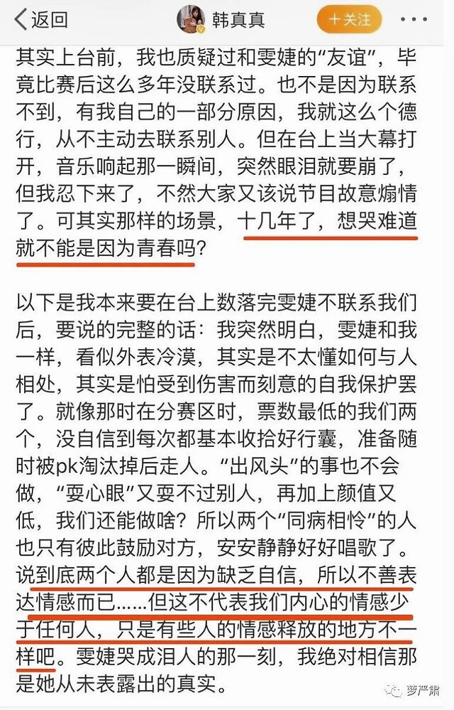 韩真真发文对尚雯婕的落泪表示理解:“十几年了,想哭难道不能是因为青春吗?”她用回忆解释尚雯婕是不善表达感情。