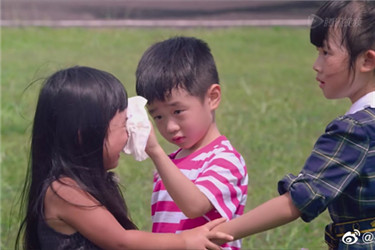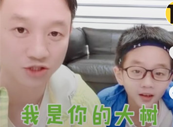 现在的他少了儿时的稚气,脸上多了一份帅气,也多了一副眼镜。旁边的妈妈杨云更是显年轻,看来在生完双胞胎女儿后她恢复得不错,满满少女气息。一家人唱着主题曲,回忆起当时的节目,别有一番风味。