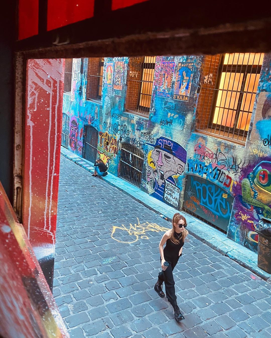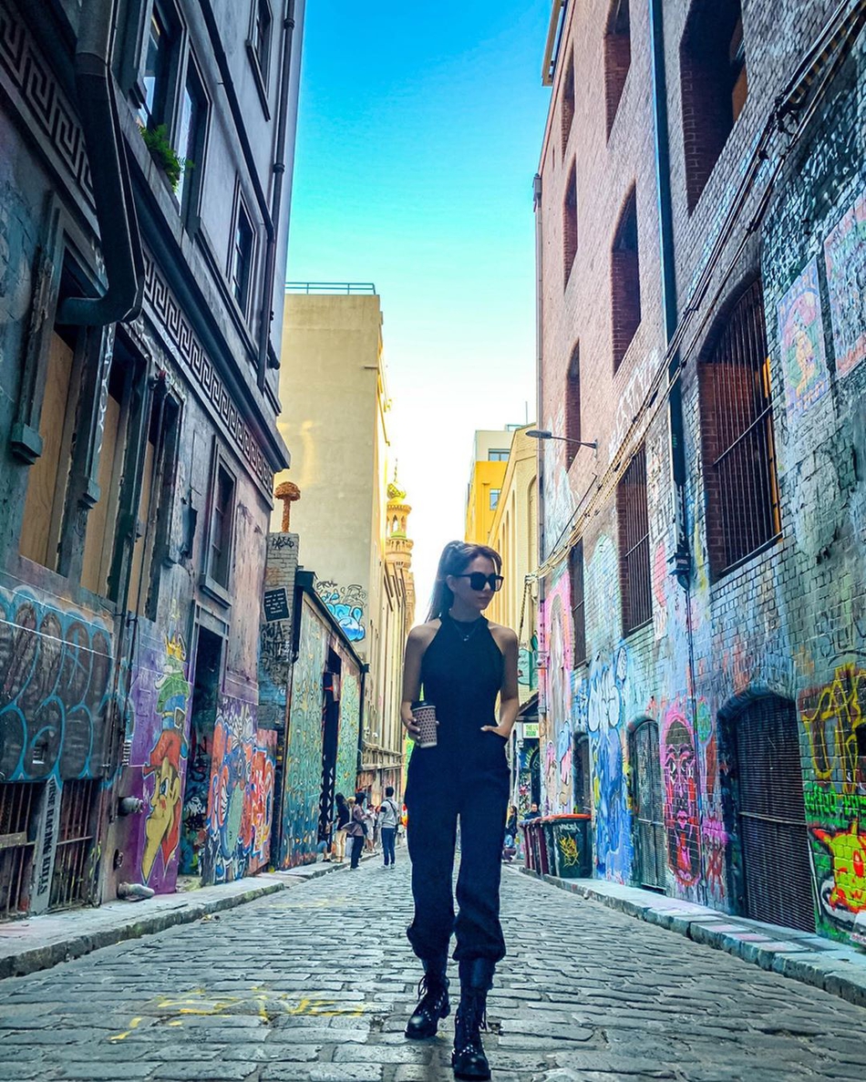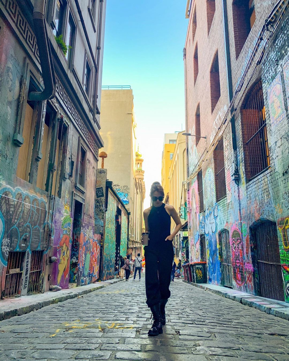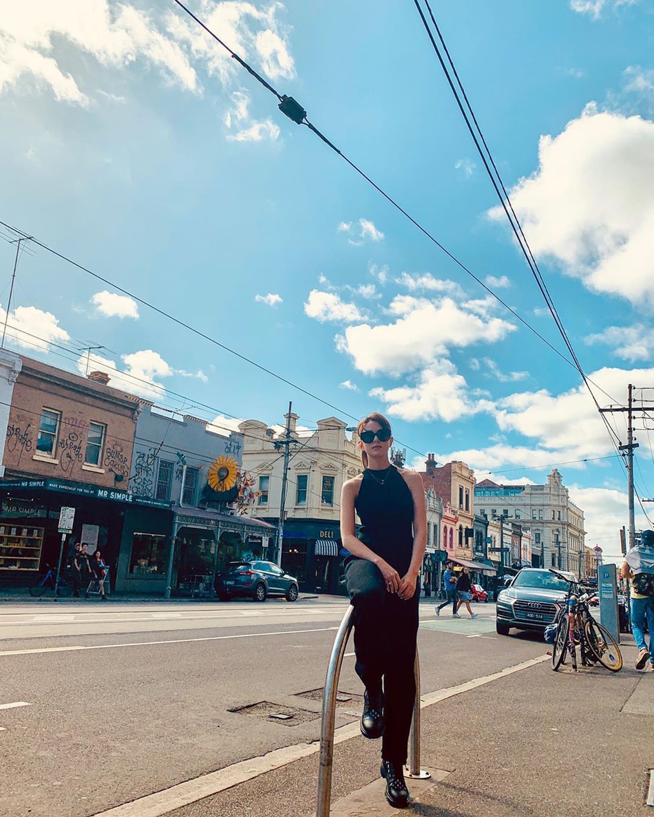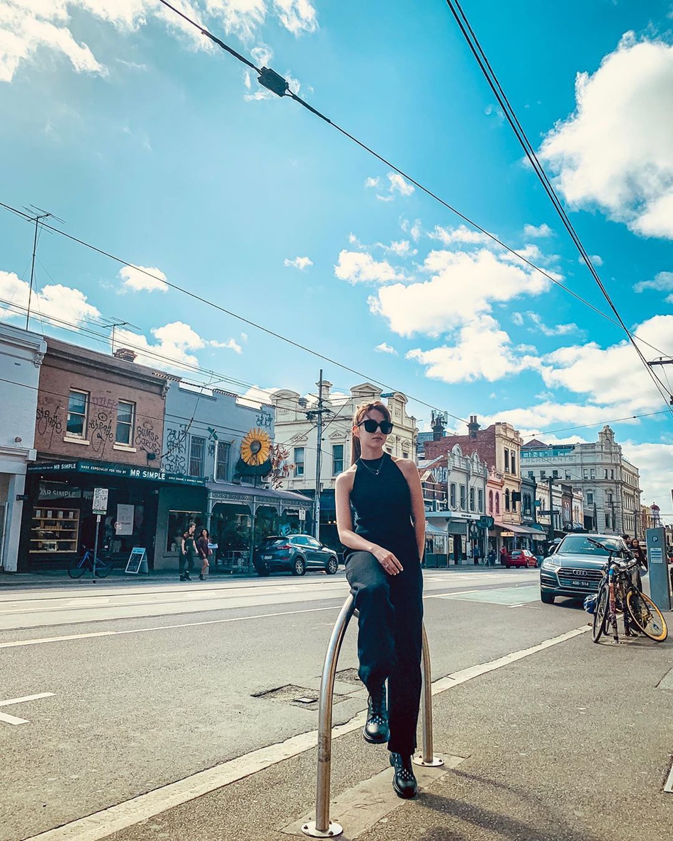 昆凌搭配工装裤和马丁靴,全黑造型气场十足,蓝天白云下架黑超摆pose超酷。