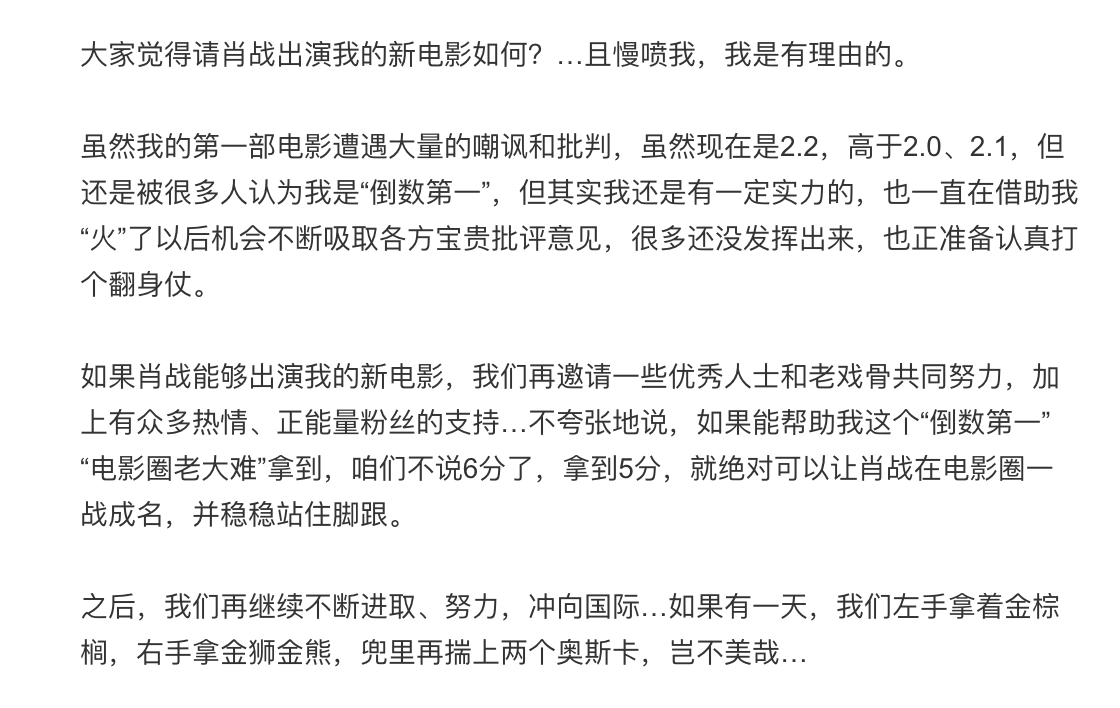 此外,毕志飞随后还表示想邀请肖战出演他的电影,表示如果肖战能够出演他的新电影,“就绝对可以让肖战在电影圈一战成名,并稳稳站住脚跟。”