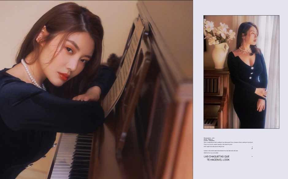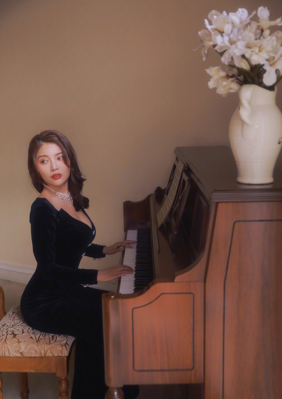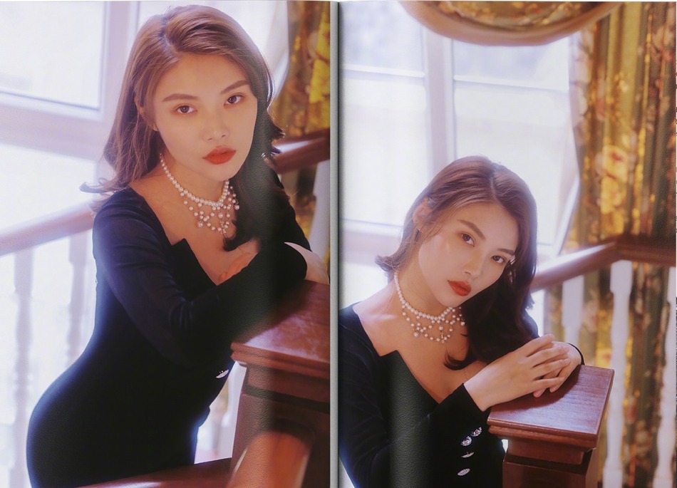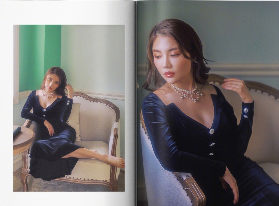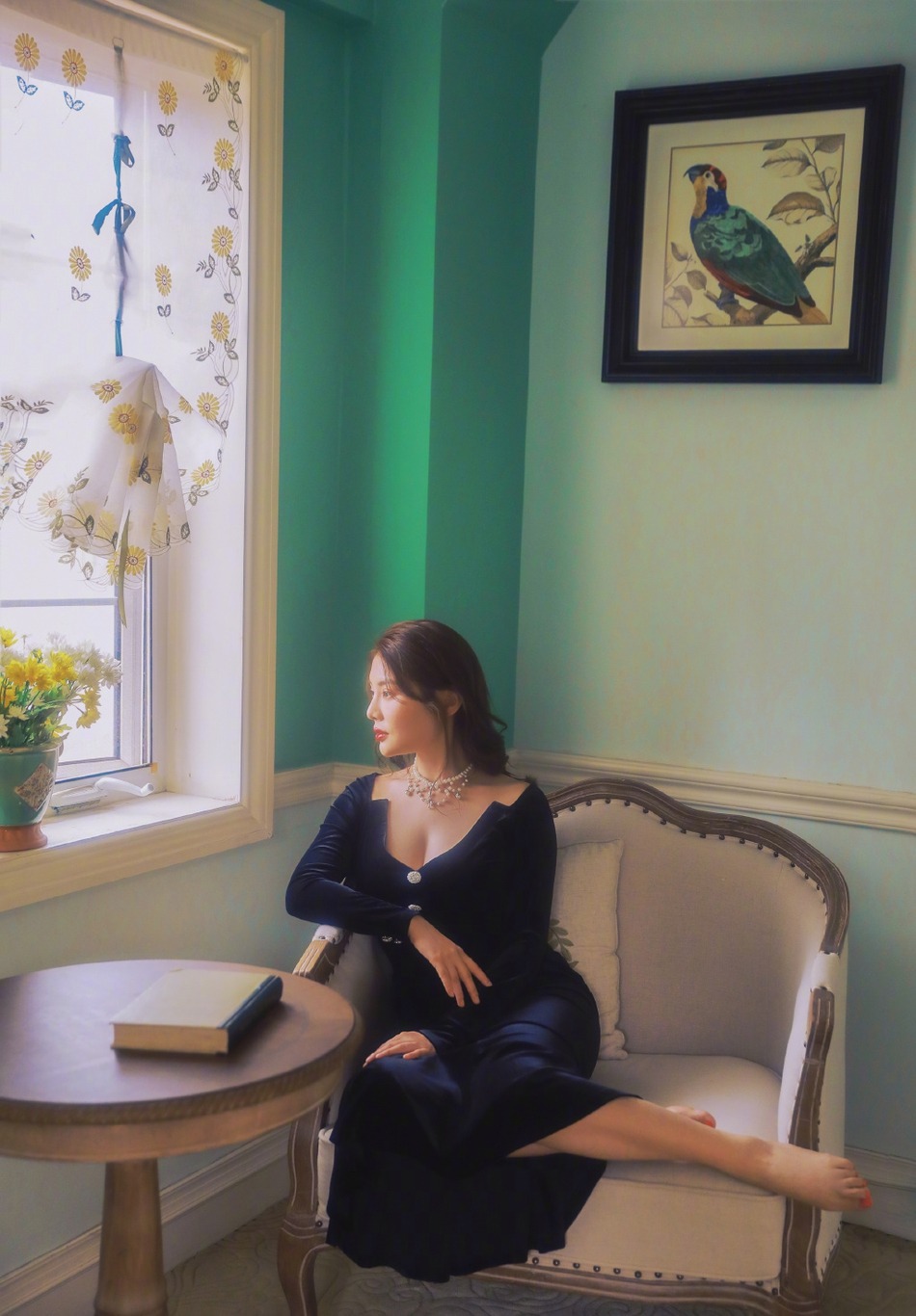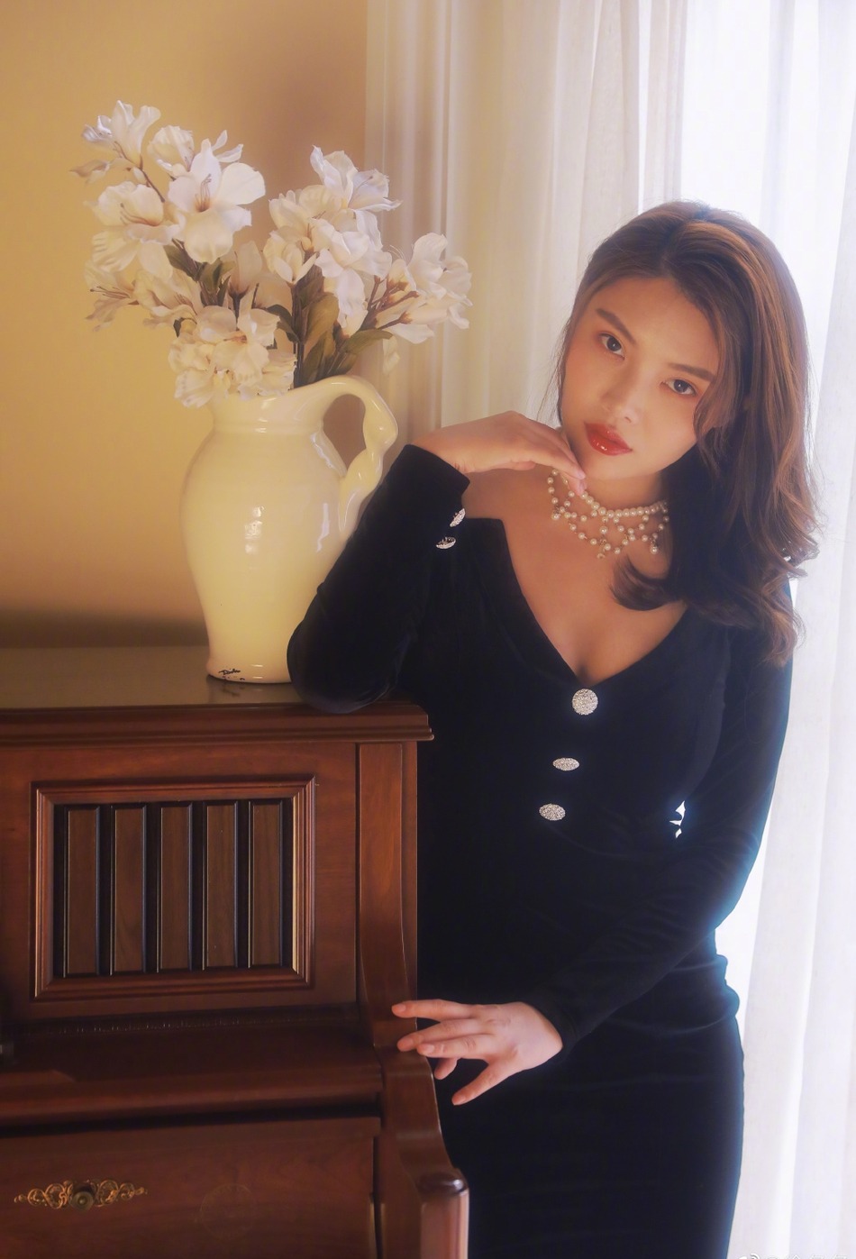照片中,她身穿低胸包臀丝绒长裙,复古优雅,大秀迷人曲线。