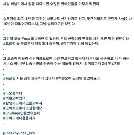 接着,该名空姐透露,她于日前在飞机上巧遇了EXO的成员伯贤,因为她的老公在两人恋爱初期一直是伯贤的狂粉,热恋期时常常会唱EXO的经典曲《咆哮》,连舞蹈都能够完美复制,甚至当作“个人技”来炫耀,于是她鼓起勇气跟伯贤要了签名。