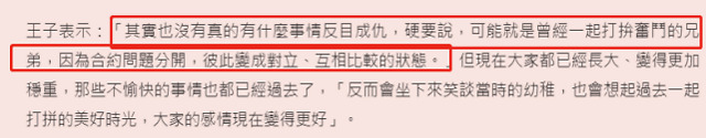 原来棒棒堂成员们之所以分道扬镳,不像外界猜测那般“反目成仇”,而是因为工作方向上渐行渐远,大家逐渐有了自己的想法,合约也变为了对立,没有办法一起继续活动。不过现在大家都已成熟,早已放下那段过去,王子透露道:“反而会坐下来笑谈当时的幼稚,也会想起过去一起打拼的美好时光,大家的感情现在变得更好。”