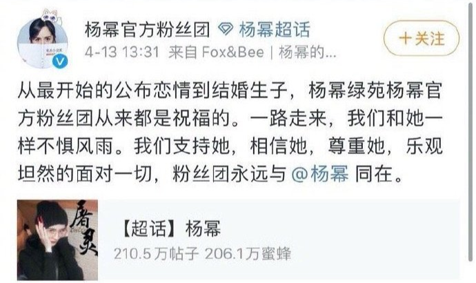 4月13日中午,杨幂官方粉丝团在杨幂超话发文表示,无论遇到什么事都会支持杨幂,坦然面对一切,与她一路同在。