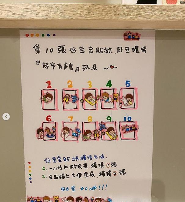从图中看出,“乖宝宝贴纸”的集点方式分为2种,一是1小时内吃完饭,另一个则是在马桶上大便,让劲宝学会靠自己争取想要的东西外,也慢慢习惯准时用餐和要到厕所上厕所。看来,劲宝的成长可观,这种育儿方式也可以供各位宝妈学习了。