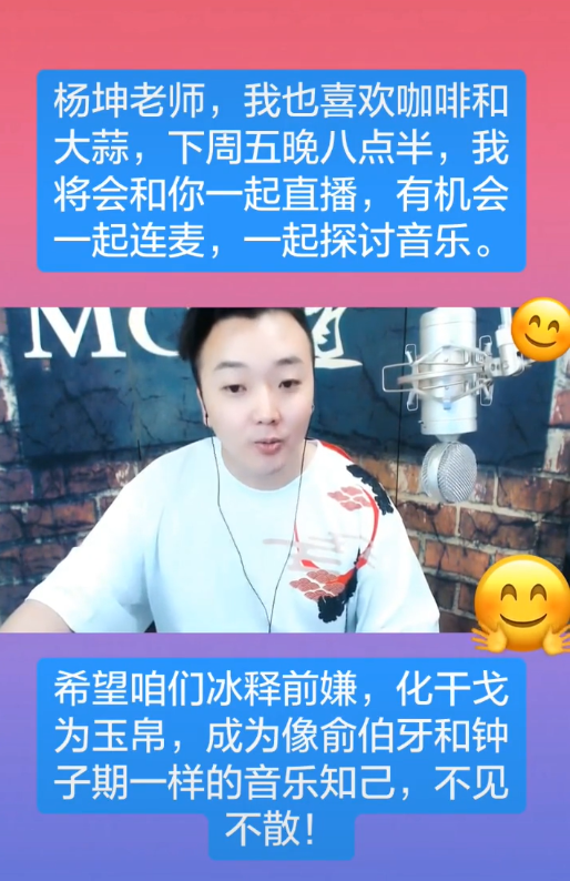杨坤这个大蒜配咖啡的视频一发,MC六道那边立刻又连发好几条回应。视频的主题就是希望和杨坤化干戈为玉帛,还表示自己想和杨坤连麦直播,一起探讨音乐。
