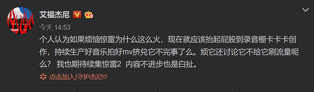 知名rapper艾福杰尼说的挺对的,与其骂人家的作品,还不如自己把音乐做好,用好作品"挤兑"你看不上的东西,既然不喜欢《惊雷》就不要给它热度。