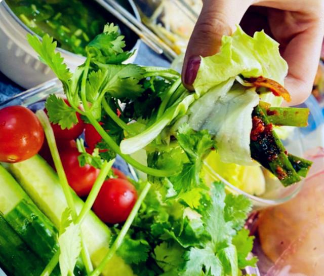 4月13日,关晓彤晒出了全素晚餐。香菜、黄瓜、圣女果,红配绿的素菜拍照超好