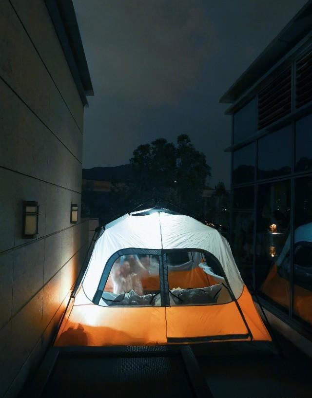 再看张晋蔡少芬晒出的照片,第一张一家五口就整整齐齐出镜,已经在天台搭好帐篷的他们,一家人坐在帐篷里享受着属于他们的亲子时光。