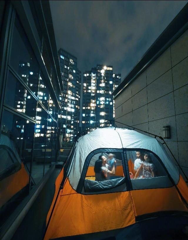 4月13日晚,夫妻俩共用一个社交账号的他们再次晒出一家五口齐出动的画面,并配文写道:天台露营,晚安。言辞之中,尽显幸福。