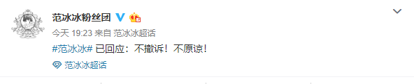 随后,范冰冰粉丝团表示得到范冰冰方的回应,她表示不会撤诉,不会原谅。