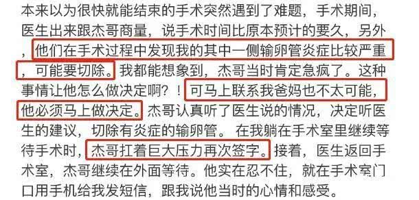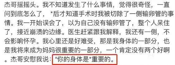 切除了一侧的输卵管,谢娜很担心,虽然医生表示这并不会影响怀孕,但毕竟器官少了一半,谢娜那个时候情绪很差,有术后的身体不适,也有心理压力,张杰一直不断地安慰谢娜,身体最重要,你最重要。