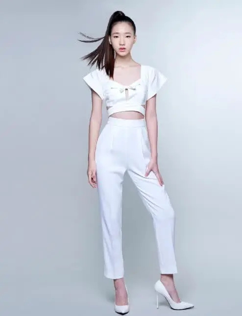许曦文穿白色露脐装搭配黑色束腰裤,脚踩白色细高跟,身材比例完美。
