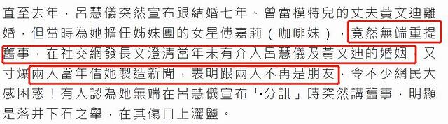 4月15日,据港媒报道,参选香港小姐而入行的TVB女星吕慧仪,去年宣布与结婚7年的模特老公黄文迪离婚,但昔日的好姐妹傅嘉莉竟然趁机重提旧事,发长文表明二人已经不再是朋友,落井下石,令不少网友感到十分困