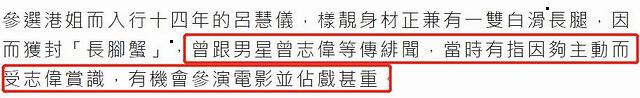 进入娱乐圈后,吕慧仪的绯闻不少,其中和曾志伟的那段绯闻最受关注,据港媒表示,当时有消息称,是因为吕慧仪足够主动而受到曾志伟的赏识,给她机会参演自己的电影,而且还担任了重要角色,使吕慧仪名气大增!